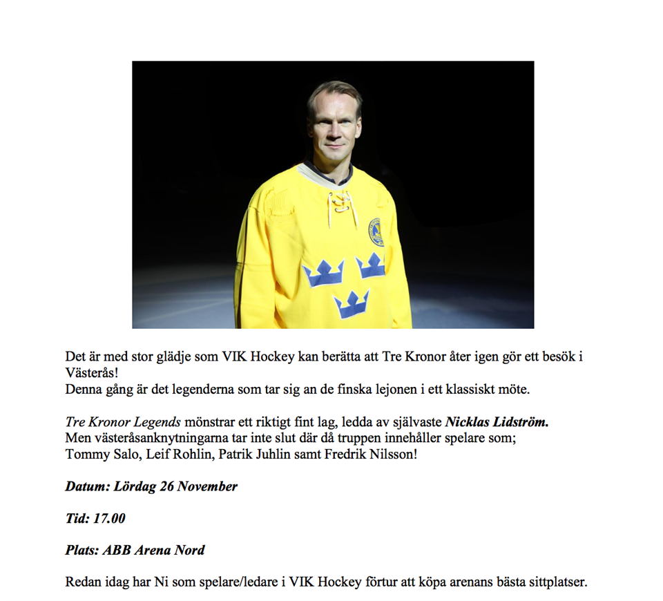Spelare/ledare har möjlighet till förköp av biljetter till Tre Kronor Legends den 26/11. Sittplats 100 kr och Ståplats 20 kr. Mejla till karin.oskarsson@icloud.com ange namn och antal biljetter. OBS! Senast imorgon torsdag 10/11 kl 22,00 vill jag ha beställningen, fredag 11/11 kl 12,00 släpps biljetterna till försäljning för allmänheten. Observera att Div 1 har bortamatch denna dag! Dam 9 nov 2016 0kommentarer