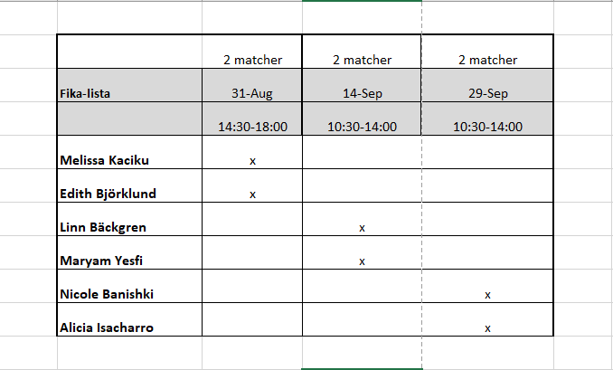 Här kommer fikaschemat för resterande matcher. Mäster Jacobs (Amelias familj) sponsrar fortsatt med: Fikabröd Dricka Festis Kexchoklad/Corny Muggar Servetter Stort TACK för det! Så ni som står på fikat behöver bara ordna med kaffe, mjölk, socker. Behöver ni byta dag då pratar ni med varandra, telefonnummer med mer finns under kontaktboken i Laget. F-13-14 12 aug 2024 0kommentarer