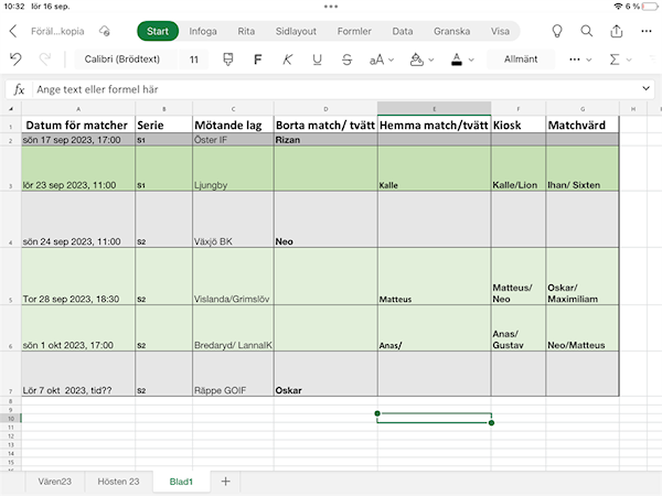 Rutinen är kiosk-värd och sen matchvärd nästa match på hemmaplan. Tvätt är också 2 ggr. De flesta har fått 2ggr/ kiosk tvätt och matchvärd. Ibland har inte vissa dykt upp och det kan vara okej att sköta uppgiften själv, men bra att föra dialog så att åtminstone en kommer. Vissa har så fått tvätta någon extra gång. Våra aktiva ledare ägnar mycket tid åt våra ungdomar så de slipper dessa uppgifter.
