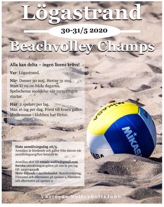 Den 31/5 arrangerar vi en inofficiell klubbtävling i beachvolleyboll! Fakta: - Damer 30 maj, Herrar 31 maj. - Alla kan delta - ingen licens krävs. - Start kl 09.00 båda dagarna. Spelschema meddelas när turneringen startar. - Max 16 lag per dag och klass. Först till kvarn gäller och medlemar i klubben har förtur framför icke medlemmar. Sista anmälningsdag 26/5. Anmälan är bindande och gäller från datum när anmälningsavgiften betalats in. Anmälan sker till emmie.wallin@gmail.com. Swisha anmälningsavgiften på 100 kr per lag till: 1232742328. (Västerås VBK) Skriv följande i meddelandet; Beachturnering, Förnamn och efternamn på spelare 1, Förnamn och efternamn på spelare 2. OBS. Turneringen kommer förhålla sig till Folhälsomyndighetens råd för sammankomster under 50 pers. Utifrån dessa avråder vi från att lagen tar med sig fler personer (anhöriga, vänner, osv) eftersom vi annars riskerar att överstiga 50 pers. Vidare har lagen ansvar för att - avanmäla sig vid minsta tecken på sjukdom eller förkylning (görs till denna E-postadress) - minska moment med närkontakt - inte dela vattenflaskor, ev munskydd eller liknande - gärna ta med egen handsprit då möjligheter till handtvätt är begränsad - följa Folkhälsomyndighetens riktlinjer till privatpersoner se nedan länk. https://www.folkhalsomyndigheten.se/smittskydd-beredskap/utbrott/aktuella-utbrott/covid-19/alla-har-ansvar-att-forhindra-smitta-av-covid-19/bromsa-smittan--det-har-kan-du-som-privatperson-gora/ I händelse av att lag tvingas dra tillbaka anmälan av ovanstående skäl betalar klubben tillbaka anmälningsavgiften. Välkomna att anmäla er till tävlingen! Allt gott alla vänner i Västerås VBK!
