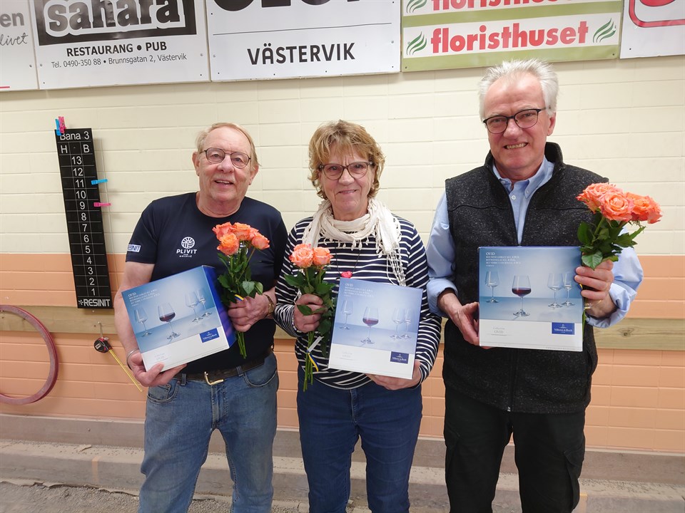 I ett alldeles strålande väder avgjordes Westerviks Boule Sällskaps tävling ELON TRIPPEL, på våra inomhusbanor! Upplägget för tävlingen var anmälda trippellag, 5 omgångar enligt Monrad, men inget slutspel. Vi spel enligt Monrad spelar man på tid, antal vinster är viktigt, likaså klotdiffen. Med 14 lag anmälda blev det spel på 7 banor och trångt, men samtliga lag visade på bra disciplin i sina ageranden. I de båda inledande omgångarna var i stort sett samtliga matcher riktigt jämna. De som stack ut i den första omgången var Ulf Jönsson/B-M Karlsson/Bo Eriksson vs Lena Pettersson/Pauli Pettersson/Bedri Potunkoj 13-1 och matchen Bernt Kedfors/Kenneth Rylander/Bertil Nilsson vs Håkan Karlsson/Stig-Ola Larsson/Sven Karlsson 13-5. I den andra omgången var det två matcher med "vinstklotdiffen" på 6 som noterades och dessa var: Kristina Grönlund/Lars Zeed/Tomas Östin vs Ulf Erlandsson/L-Å Sandberg/Ebbe Andersson 7-13 Kerstin DiMeo/Mats Hedin/Daniel Borgen vs B-Å Nilsson/Stefan Edström/Arne Andersson 12-6 Men allra mest blev det i matchen mellan Lasse Wåhlberg/Annette Wåhlberg/Boo Stalebrant vs Håkan Gustavsson/Kerstin Ljungdahl/Tomas Ljungdahl och resultatet 4-12. Av de tre lag som gick in i den tredje omgången med bara vinster, så klarade sig två vidare med vinst och dessa var Ulf Jönsson/B-M Karlsson/Bo Eriksson och Håkan Gustavsson/Kerstin Ljungdahl/Tomas Ljungdahl. Ett skifte av banor i den fjärde omgången gjorde ett märkbart avtryck i resultatet med 0-10, 6-13, 2-13, 3-13, och 13-1, där lag som aspirerade på de bästa placeringarna gick ner sig inte så lite, inför den femte och sista omgången. I den femte och avgörande omgången var det laget med Håkan Gustavsson/Kerstin Ljungdahl/Tomas Ljungdahl som hade 4 vinster/8 poäng som låg i vinnarhålet. Följt av tre lag med 3 vinster/6 poäng och dessa var: Ulf Jönsson/B-M Karlsson/Bo Eriksson 12 klotdiff Ulf Erlandsson/L-Å Sandberg/Ebbe Andersson 14 klotdiff Kristina Grönlund/Lars Zeed/Tomas Östin 4 klotdiff Jan Edström/Leif Schenell/Arne Jonasson 17 klotdiff Men, den femte omgångens resultat kastade om rejält i den förväntade toppen, som blev följande: 1a och vinnare i ELON TRIPPEL, Håkan Gustavsson/Kerstin Ljungdahl/Tomas Ljungdahl 10 poäng/5 vinster 23 klotdiff 2a plats, Ulf Jönsson/B-M Karlsson/Bo Eriksson, 4 vinster/8 poäng 24 klotdiff 3e plats, Kristina Grönlund/Lars Zeed/Tomas Östin, 4 vinster/8 poäng 15 klotdiff Ett lag som gick lite under radarn, Boo Stalebrant/Annette Wåhlberg/Lasse Wåhlberg spelade till sig 3 vinster/6 poäng och 3 klotdiff och med det kom laget på 5:te plats. Starkt jobbat! Särskilt en tumme upp för båda Wåhlbergs som är riktigt duktiga läggare! De bästa lagen premierades med rosor och väl tilltagna priser från tävlingens sponsor ELON COLDMAN! Tävlingskommittén tackar gästande lag för bra och väl genomförda matcher och ELON COLDMAN för priserna!