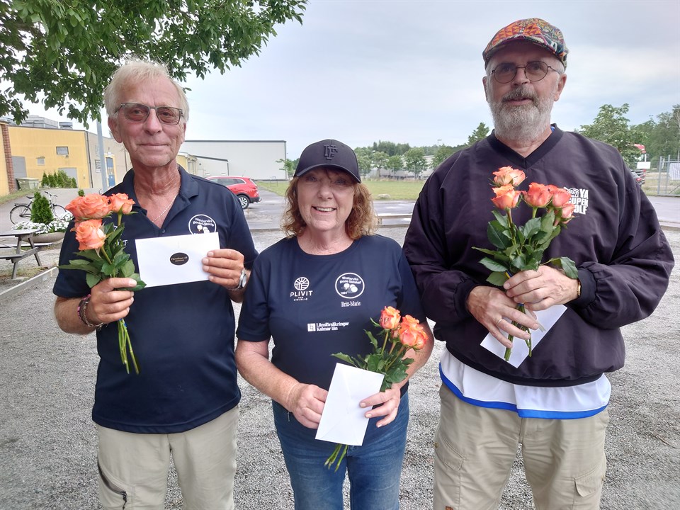Precis som vid förra årets nedgång av smittoläget för Covid 19 bjuder Westerviks Boule Sällskap in till ett upplägg av "Sommartävlingar" även 2021! Ett upplägg som vi hoppas ska uppskattas av både våra medlemmar och inbjudna klubbar! Attraktiva tävlingar - attraktiva priser från våra sponsorer torde locka fler och fler till våra tävlingar! Onsdagens tävling och dess upplägg var gruppspel och från grupperna gick de två bästa lagen vidare till semi- och finalspel. Från grupp 1 gick WBS-laget Jan Edström-Stefan Edström-Uno Englund vidare med hela 4 vinster/8 poäng och +25 i klotdiff. På andra plats kom ett lag från Loftahammar, Hasse Hydén-Stefan Berg-Gunnar Wiström, som glatt överraskade fick stanna kvar för fortsatt spel, efter 2 vinster-2 förluster och +9 i klotdiff. Det i särklass bästa laget från grupp 2 var Kerstin Ljungdahl, Tomas Ljungdahl och Håkan Karlsson, Överum. Med sina 4 vinster/8 poäng och +36 i klotdiff var laget outstanding. WBS-laget med Ulf Jönsson-Britt-Marie Karlsson-Bo Eriksson kunde med 2 vinster och 2 förluster + 8 klotdiff, säkra fortsatt spel i en av semifinalerna. Semifinalerna spelades mellan Jan Edström-Stefan Edström-Uno Englund vs Ulf Jönsson-Britt-Marie Karlsson-Bo Eriksson och här vann Ulf Jönsson-Britt-Marie Karlsson-Bo Eriksson med klara 13-4. Den andra semifinalen, Kerstin Ljungdahl, Tomas Ljungdahl och Håkan Karlsson från Överum vs Hasse Hydén-Stefan Berg-Gunnar Wiström från Loftahammar blev en riktig långkörare! Lagen följdes åt i sin poängtagning genom 1-0, 1-1, 2-1, 2-2 upp till 7-8 och här kunde matchen varit klar då Överumslaget, efter en 5a tog en ledning med 12-8. Omgången efter......... Utkastet av lillen gjorde Överum, första klotet 1 meter från lillen, Loftahammar lägger nära lillen, Överums klot 2 stannade på samma ställe som förstalägget, för att få en bättre tvåa lägger Överum klot 3 lite bättre än de två första............Och, utan att dra ut på det så lägger/skjuter Överum bort samtliga klot. Loftahammar kan därefter lägga in klot som ger 5 poäng och vinner matchen med 13-12. En helt oväntad men välförtjänt vinst! Finalen kom därefter att spelas mellan WBS-laget Ulf Jönsson-Britt-Marie Karlsson-Bo Eriksson vs Loftahammar, Hasse Hydén-Stefan Berg-Gunnar Wiström. En match där Britt-Marie Karlsson briljerade med utstuderat fina lägg på lillen, kompletterat med bra skytte av Bo Eriksson och grymt fina lägg av Ulf Jönsson. Laget från Loftahammar mötte visserligen sina övermän, men Bergs skytte blev bättre och bättre under matchens gång, Hydéns vänsterhand har en osviklig känsla för närspel och Wiström kompletterar laget med att gå till final i 2021 års första "Sommartävling". WBS-laget Ulf Jönsson-Britt-Marie Karlsson-Bo Eriksson vann med 13-6. De bästa lagen premierades rikligt av tävlingens sponsor - FLORISTHUSET! Tävlingskommittén tackar lagen för bra matcher, som genomfördes med mycket mer än en glimt i ögat!