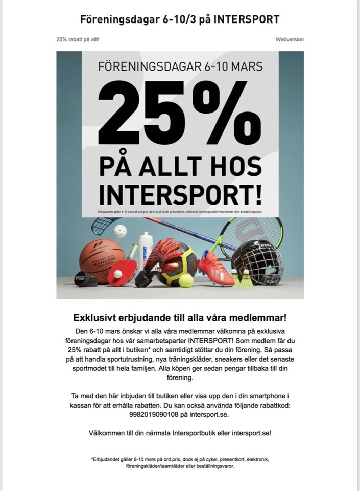 Den 6-10 mars önskar vi alla medlemmar välkomna på exklusiva föreningsdagar hos vår samarbetsparter INTERSPORT! Som medlem får du 25% rabatt på allt i butiken* och samtidigt stöttar du din förening. Visa upp detta inlägg i kassan för att erhålla rabatten eller använd följande rabattkod: 9982019090108 på intersport.se. Alla köpen ger sedan pengar tillbaka till din förening. *Erbjudandet gäller 6-10 mars på ord.pris, dock ej på cykel, presentkort, elektronik, föreningskläder/teamkläder eller beställningsvaror. #intersport #foreningsdagar