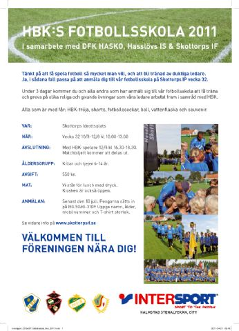 Vecka 32 10/8-12/8 bjuder DFK Hasko, Hasslövs IS och Skottorps IF in till HBK:s fotbollsskola. Under 3 dagar kommer du och alla andra som har anmält sig till vår fotbollsskola att få träna och prova på olika roliga och givande övningar som våra ledare arbetat fram i samråd med HBK. Alla som är med får: HBK-tröja, shorts, fotbollssockar, boll, vattenfl aska och souvenir. VAR: Skottorps Idrottsplats NÄR: Vecka 32 10/8-12/8 kl 10.00-13.00 AVSLUTNING: Med HBK-spelare 12/8 kl 16.30-18.30. Matchbiljett kommer att delas ut. ÅLDERSGRUPP: Killar och tjejer 6-14 år. AVGIFT: 550 kr. MAT: Vi står för lunch med dryck. Kiosken är också öppen. ANMÄLAN: Senast den 10 juli. Pengarna sätts in på BG 5060-3109 Uppge namn, ålder, mobilnummer och T-shirt storlek. Se vidare info på www.skottorpsif.se WRY Föreningssida 23 jun 2011 0kommentarer