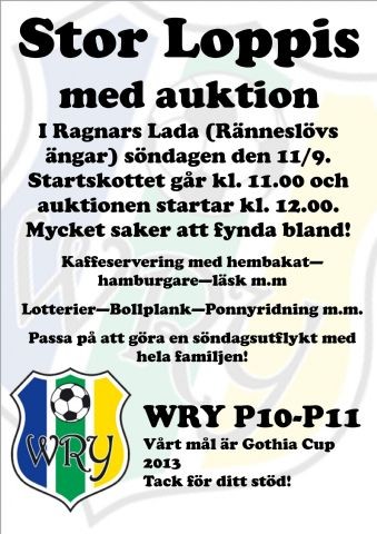 Söndagen den 11 september är ni hjärtligt välkomna till stor loppis i Ragnars Lada (Ränneslövs ängar). Startskottet går kl. 11.00 och auktionen startar kl. 12.00. Det finns mycket saker att fynda bland! Kaffeservering med hembakat—hamburgare—läsk m.m Lotterier—Bollplank—Ponnyridning m.m. Passa på att göra en söndagsutflykt med hela familjen! WRY P10-P11 Vårt mål är Gothia Cup 2013 Tack för ditt stöd! WRY Föreningssida 24 aug 2011 0kommentarer