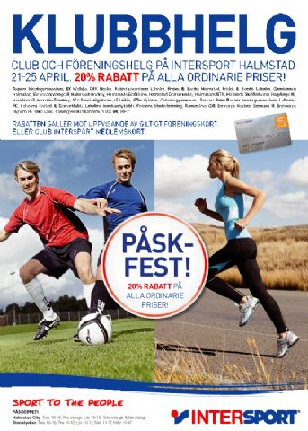 Vi har fått inbjudan från Intersport i Halmstad om klubbhelg 21-25 april. De lämnar 20% rabatt på alla ordinarie priser. På inbjudan står det att man ska uppvisa medlemskort men efter kontakt med butiksinnehavaren så ska det räcka att man säger att man kommer från WRY. Ni som har träningsoverall kan ju ha den på så blir det inget snack....!