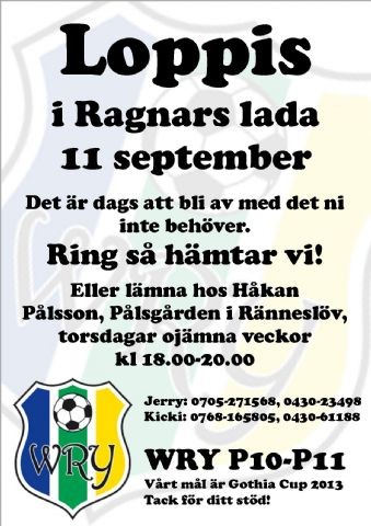Den 11 september är det loppis i Ragnars lada. I år är det P10-P11 som ansvarar för loppisen. Har ni något som ni vill skänka så ring: Jerry, 0705-271568 eller 0430-23498 Kicki, 0768-165805 eller 0430-61188 Eller lämna hos Håkan Pålsson, Pålsgården i Ränneslöv, på torsdagar ojämna veckor mellan kl. 18.00 och 20.00. Tack för ditt stöd!